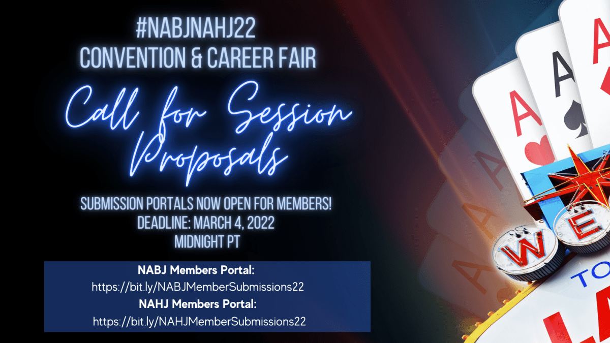 The National Association of Black Journalists (NABJ) and the National Association of Hispanic Journalists (NAHJ) have opened the #NABJNAHJ22 Convention & Career Fair Call for Session Proposals. The convention is scheduled for August 3-7, 2022.